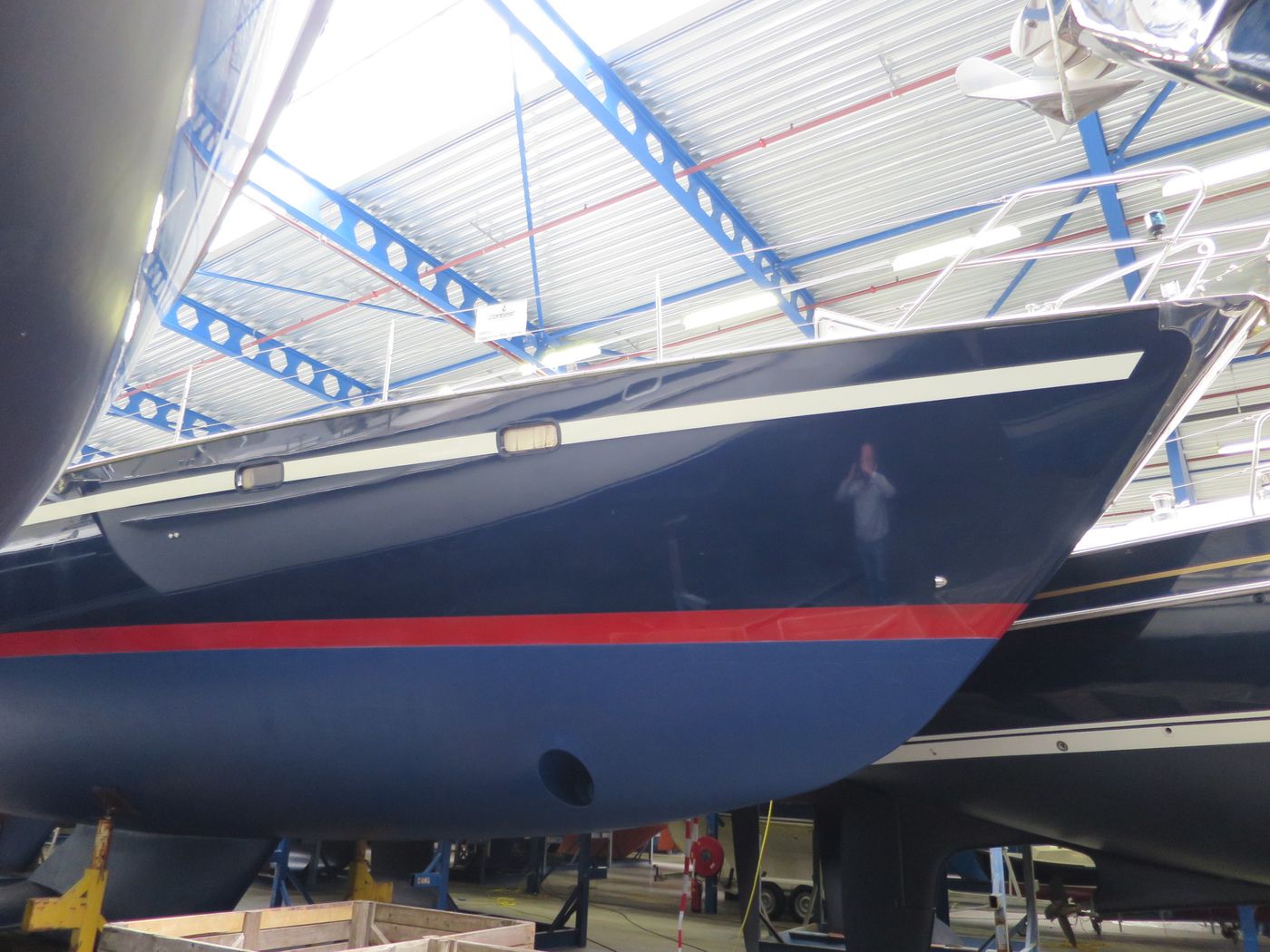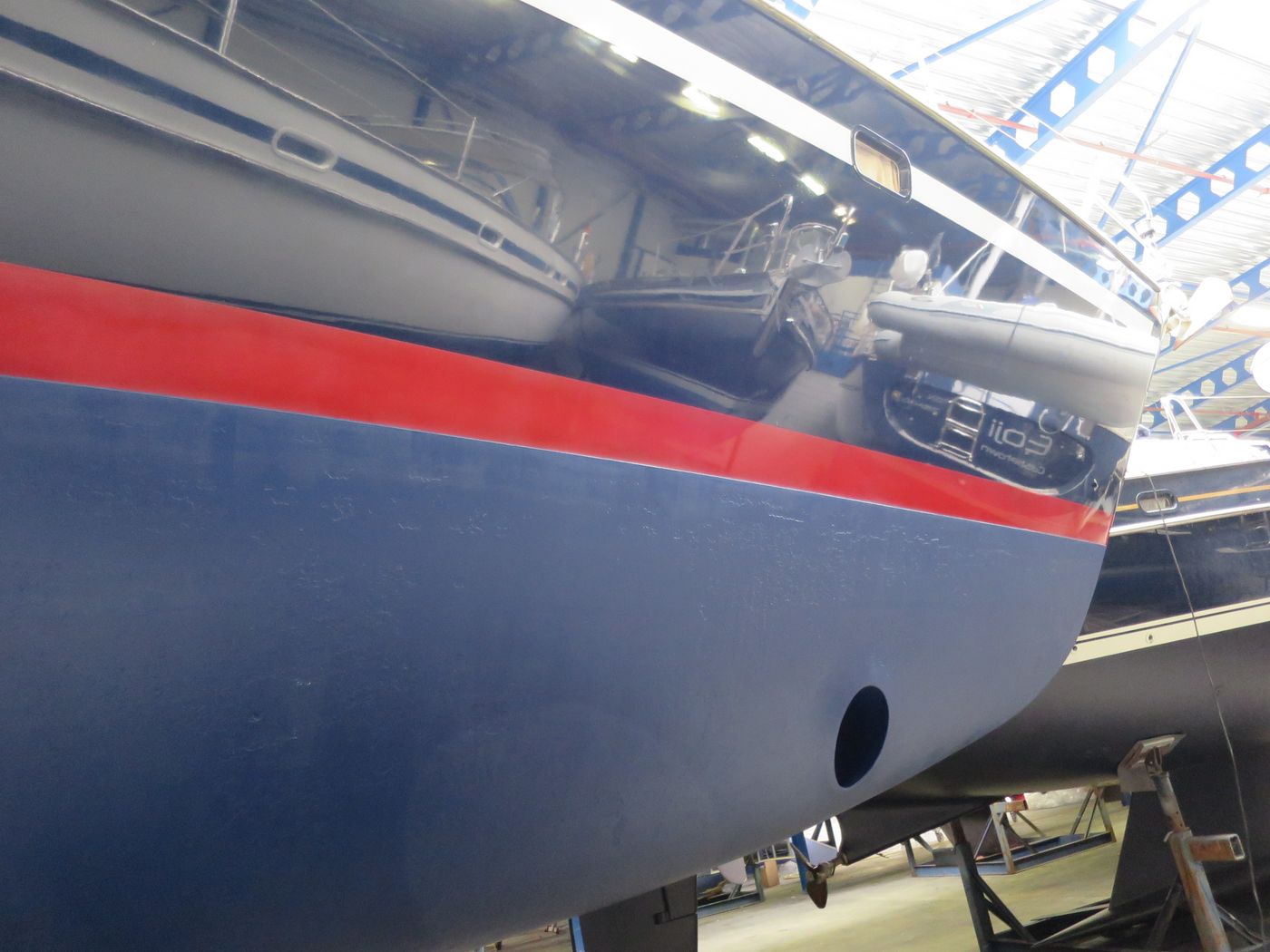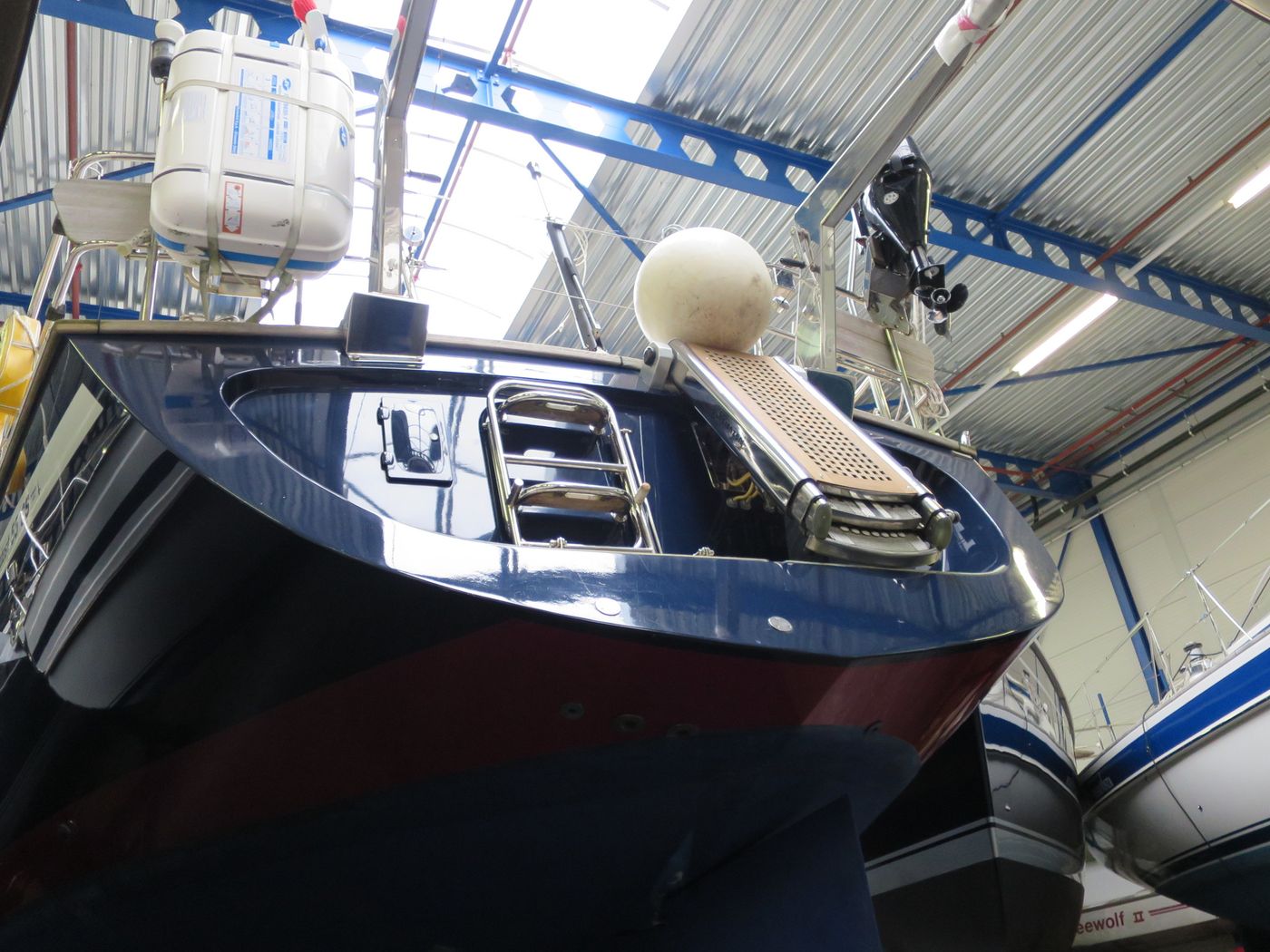 Hull typeVacuum infused round bilged hull in flag blue with oyster white striping