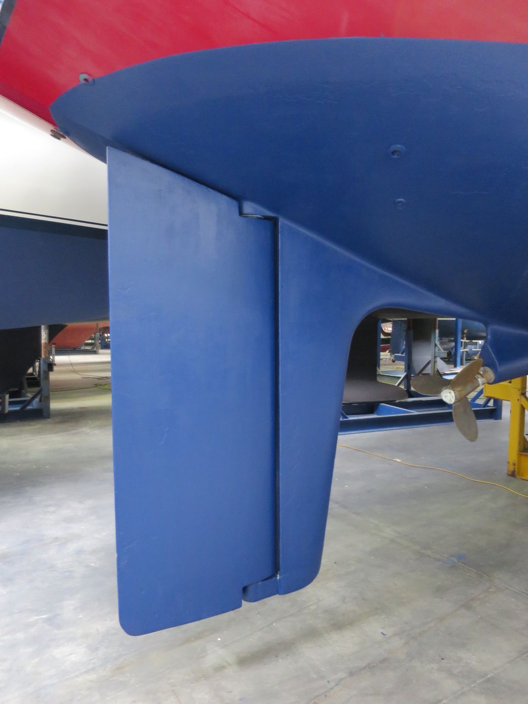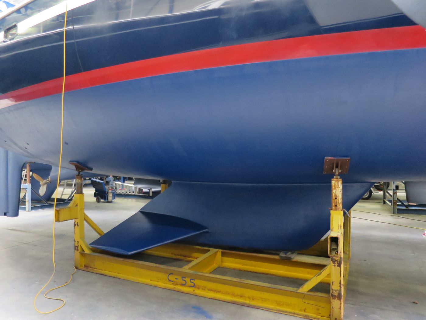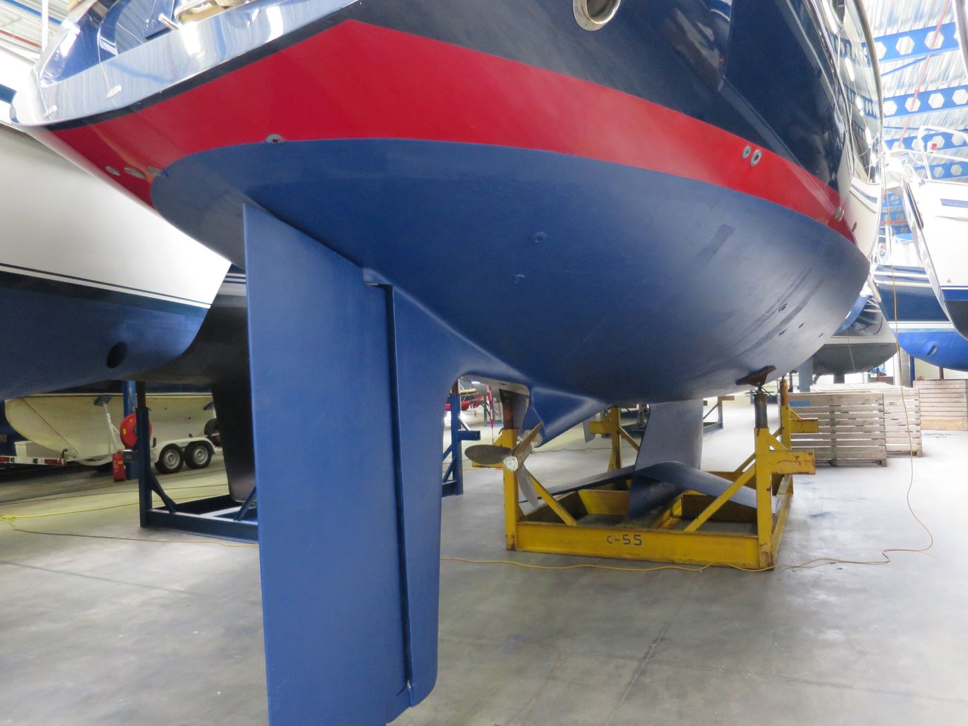 Hull typeVacuum infused round bilged hull in flag blue with oyster white striping