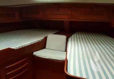 The HR 45 combined all Hallberg-Rassy’s traditional hallmarks, like style, sturdiness, comfort, fine woodwork, technical installations and an ample tank capacity with sailing characteristics unsurpassed for a sailing boat of this type. She has undergone several refits to include the teak deck, engine, hydraulics and navigation instruments. Now she is ready to do some great blue water cruising! Please contact us for further information. Please note that this brochure is preliminary and that a 5% commission rate (plus VAT) will be added to the selling price! (photo of sistership)