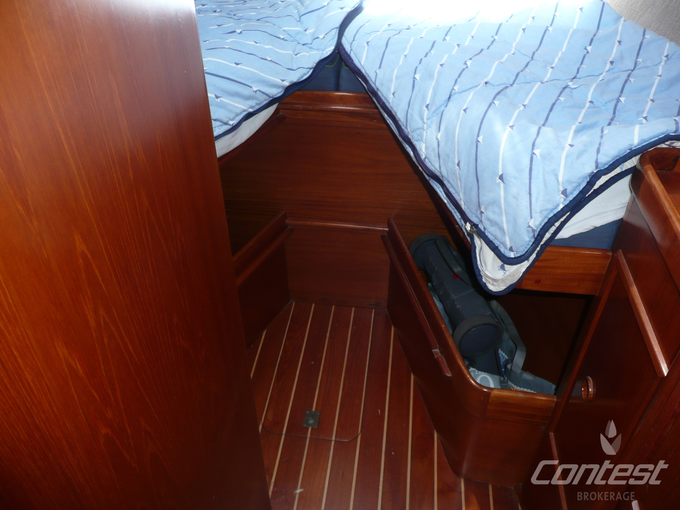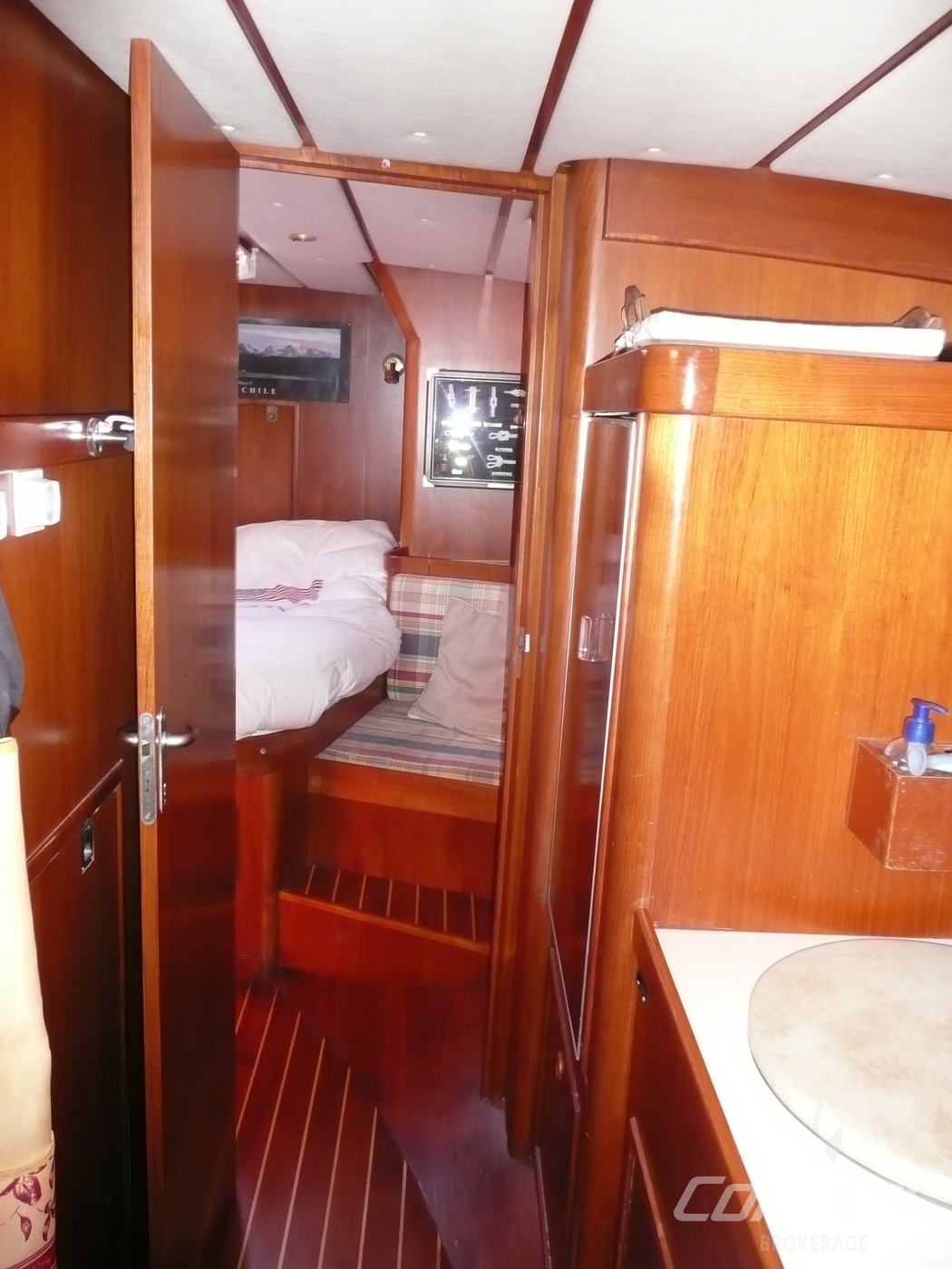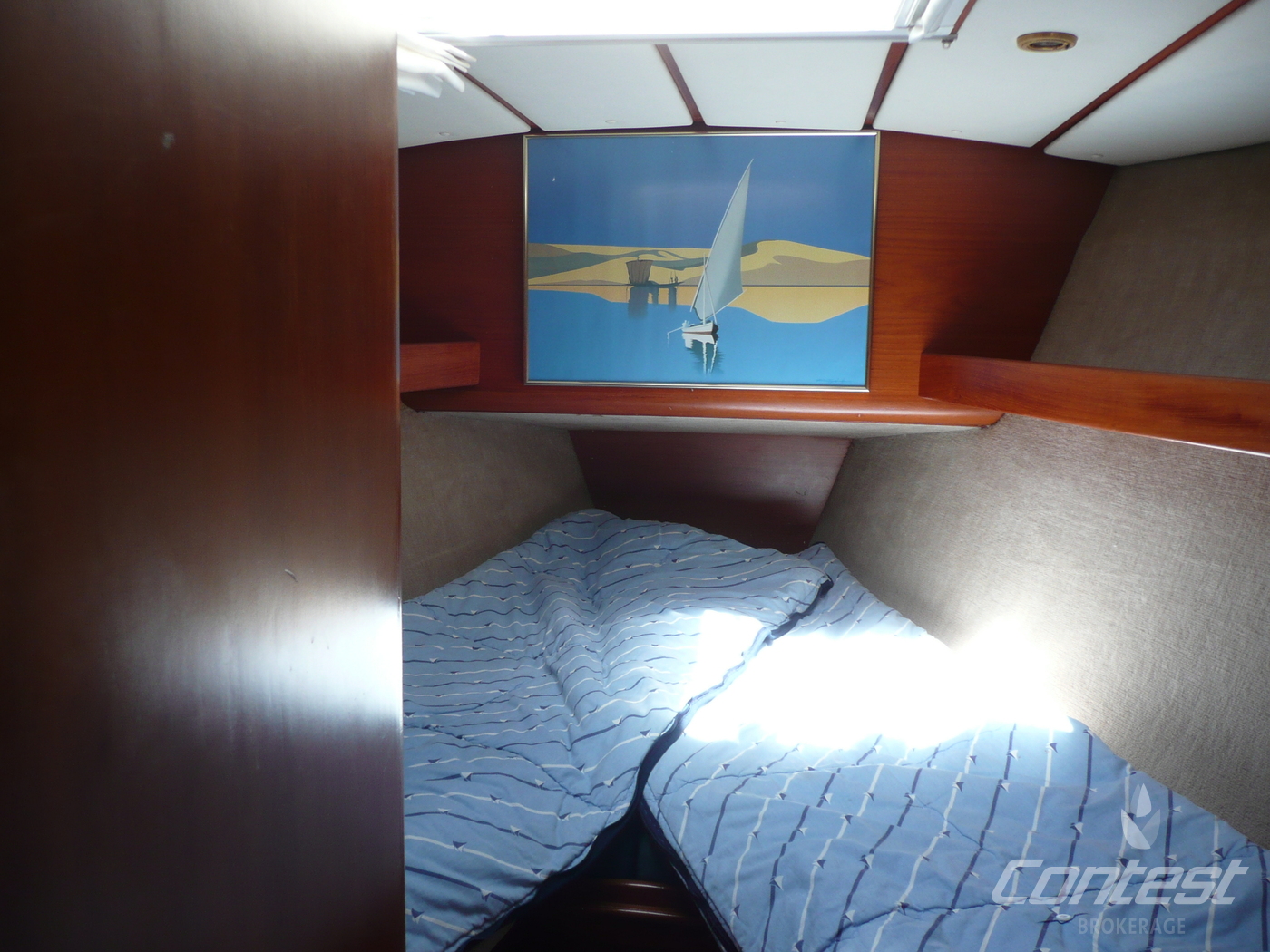 CabinsOwners cabin in aft, guest cabin in front with V-bed and guest cabin with bunk beds in passage to front