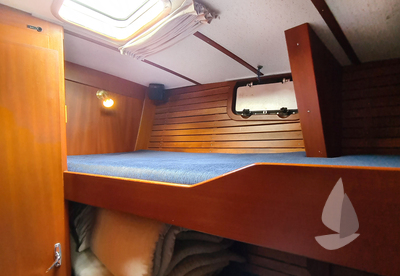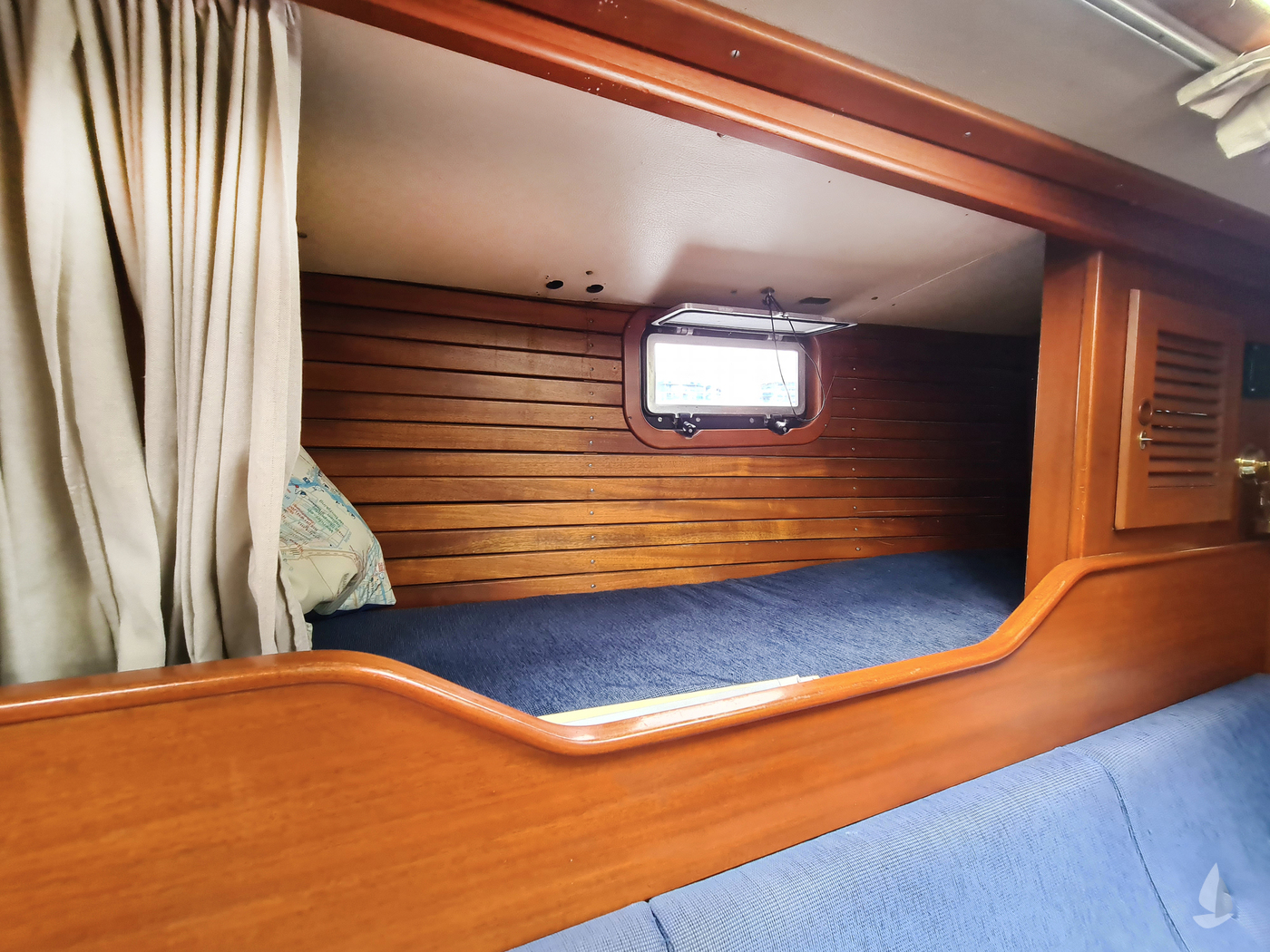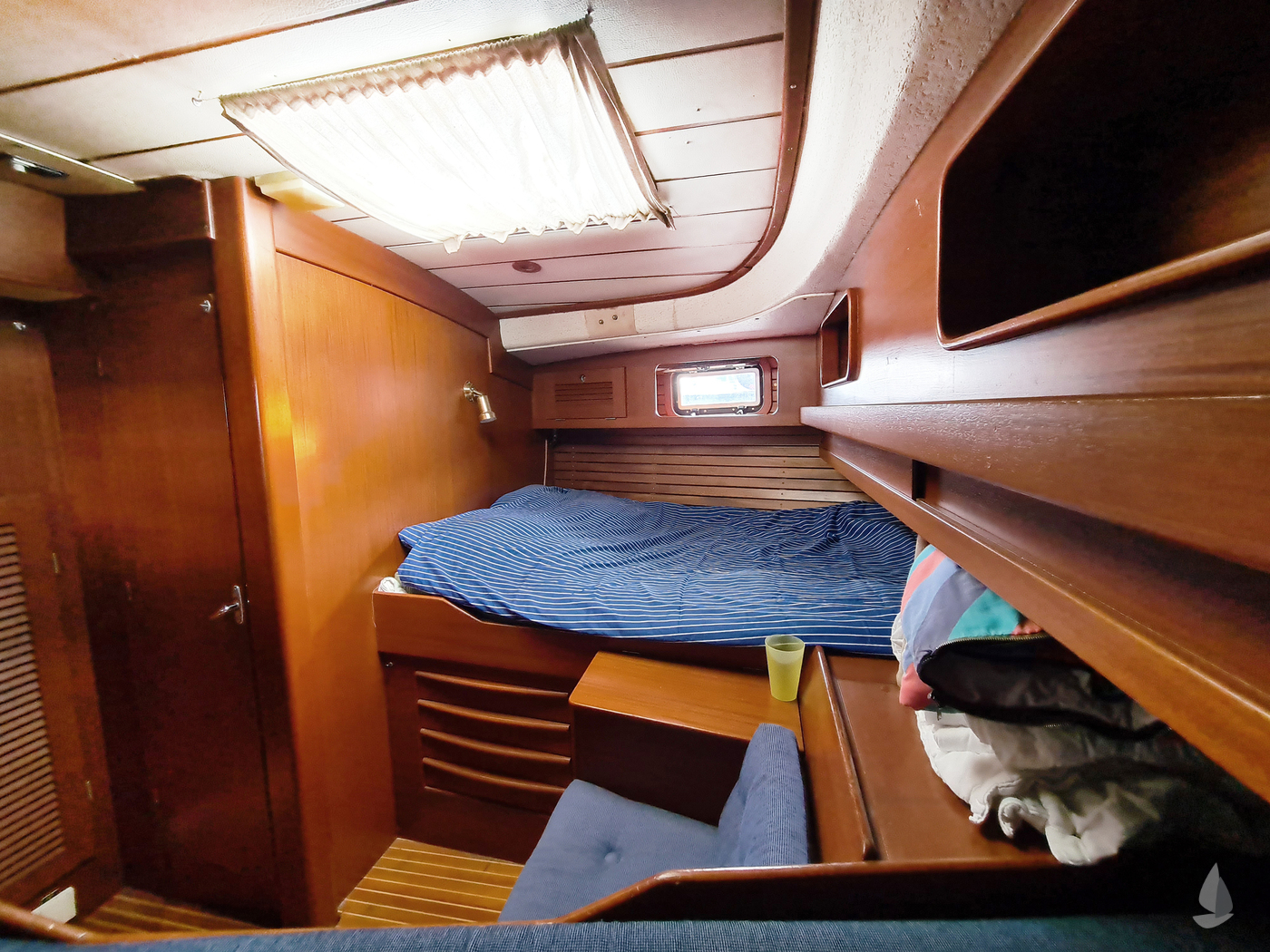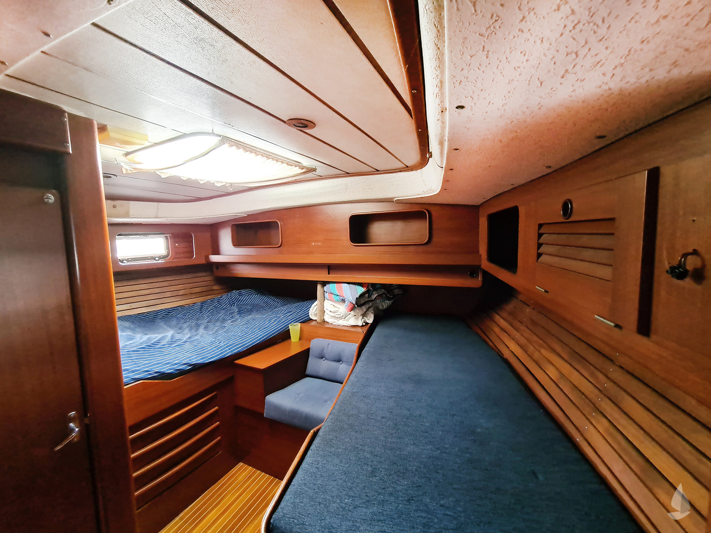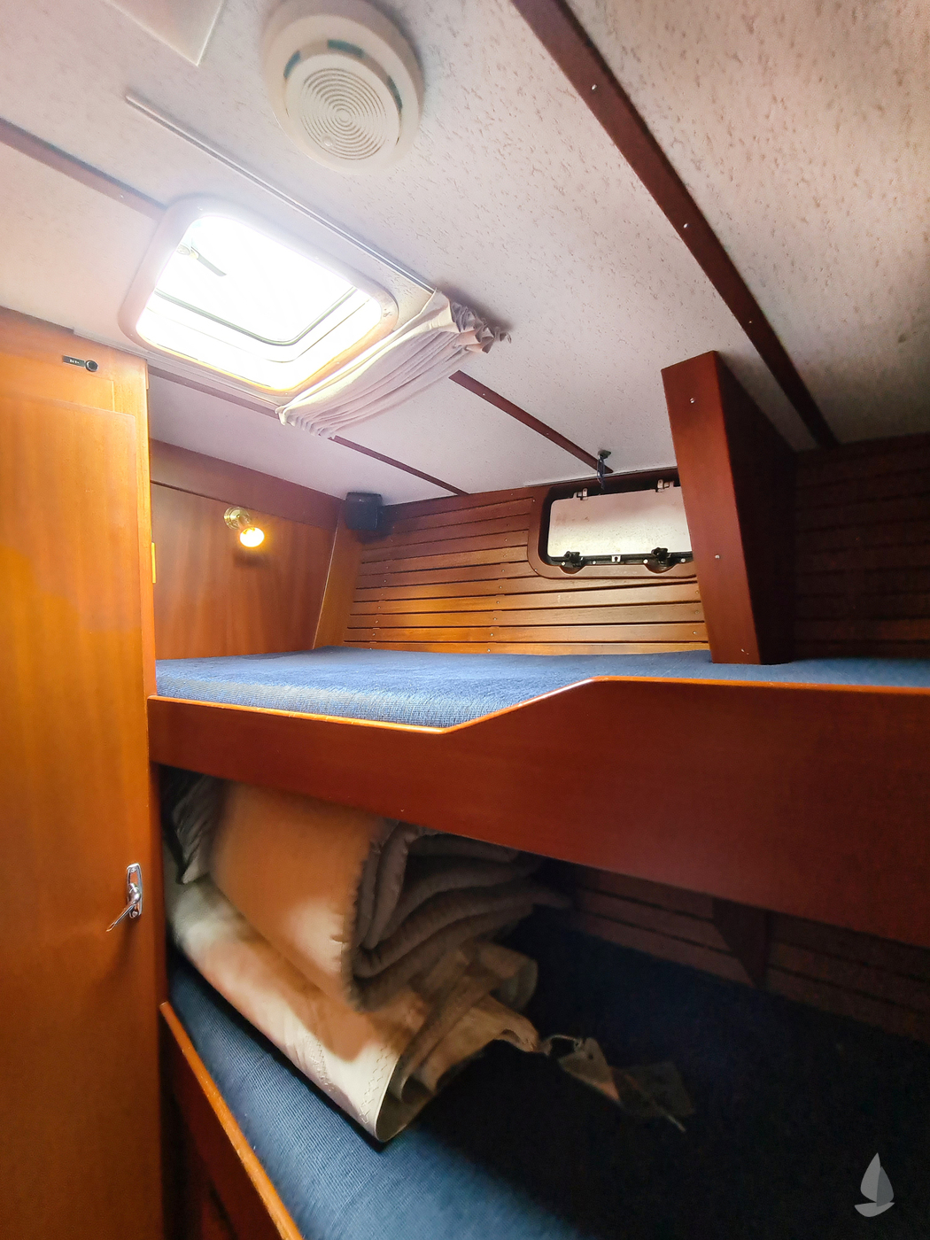 CabinsEigenaars hut in het achterschip, V-bed in de boeg, stapelbed vlak bij de boeg en twee stapelbedden in de salon.