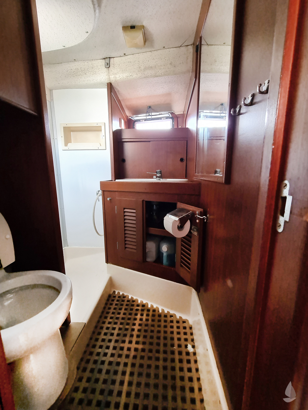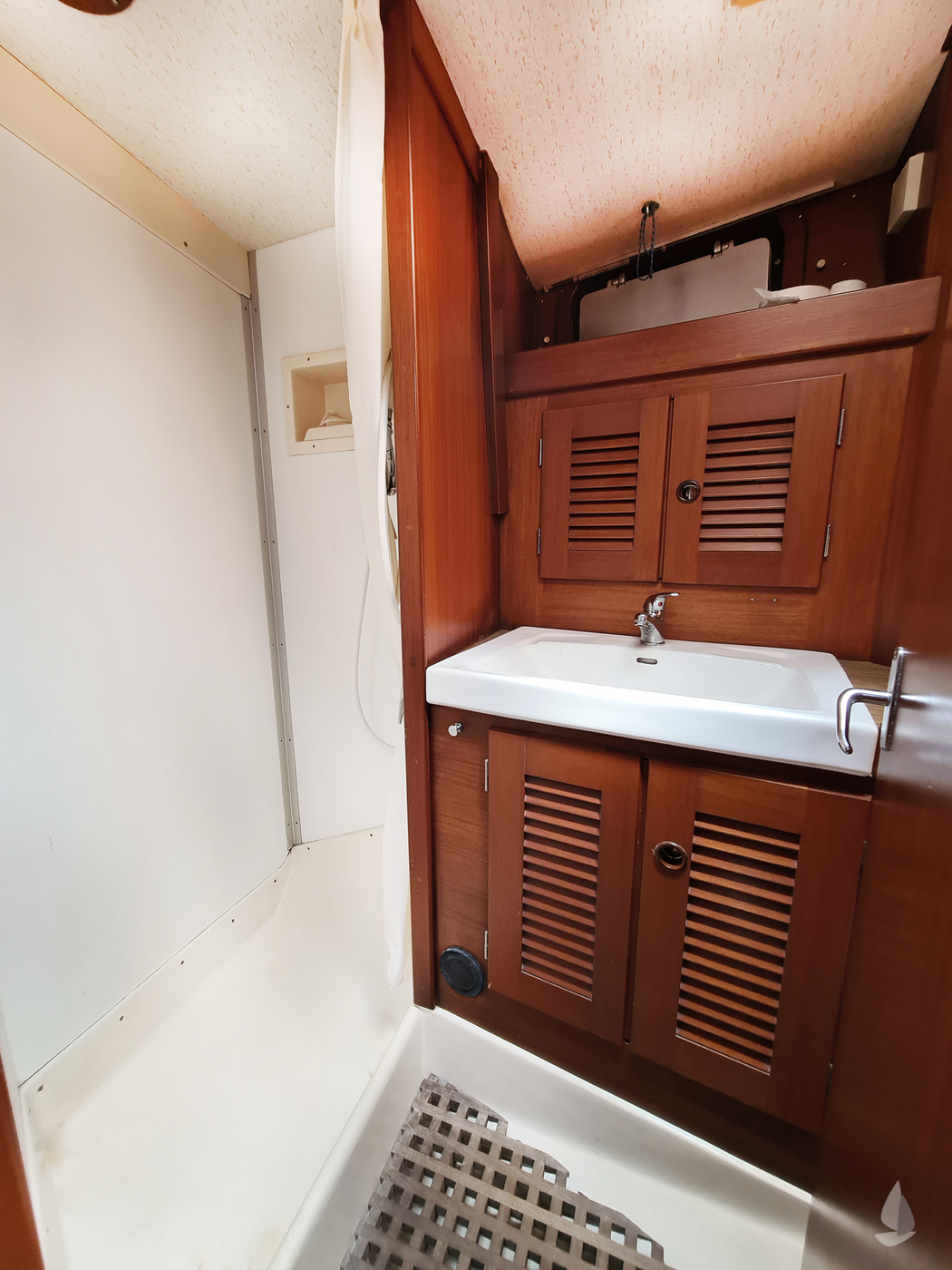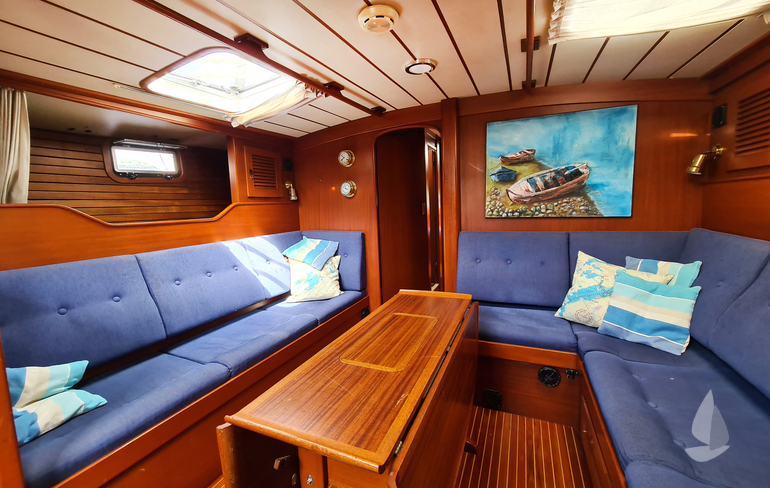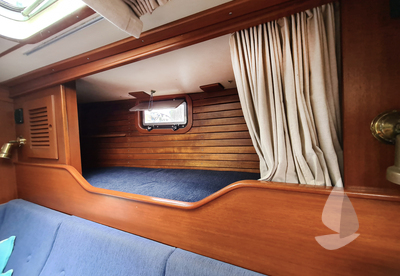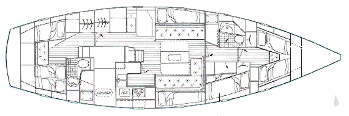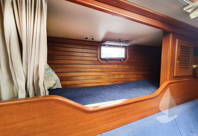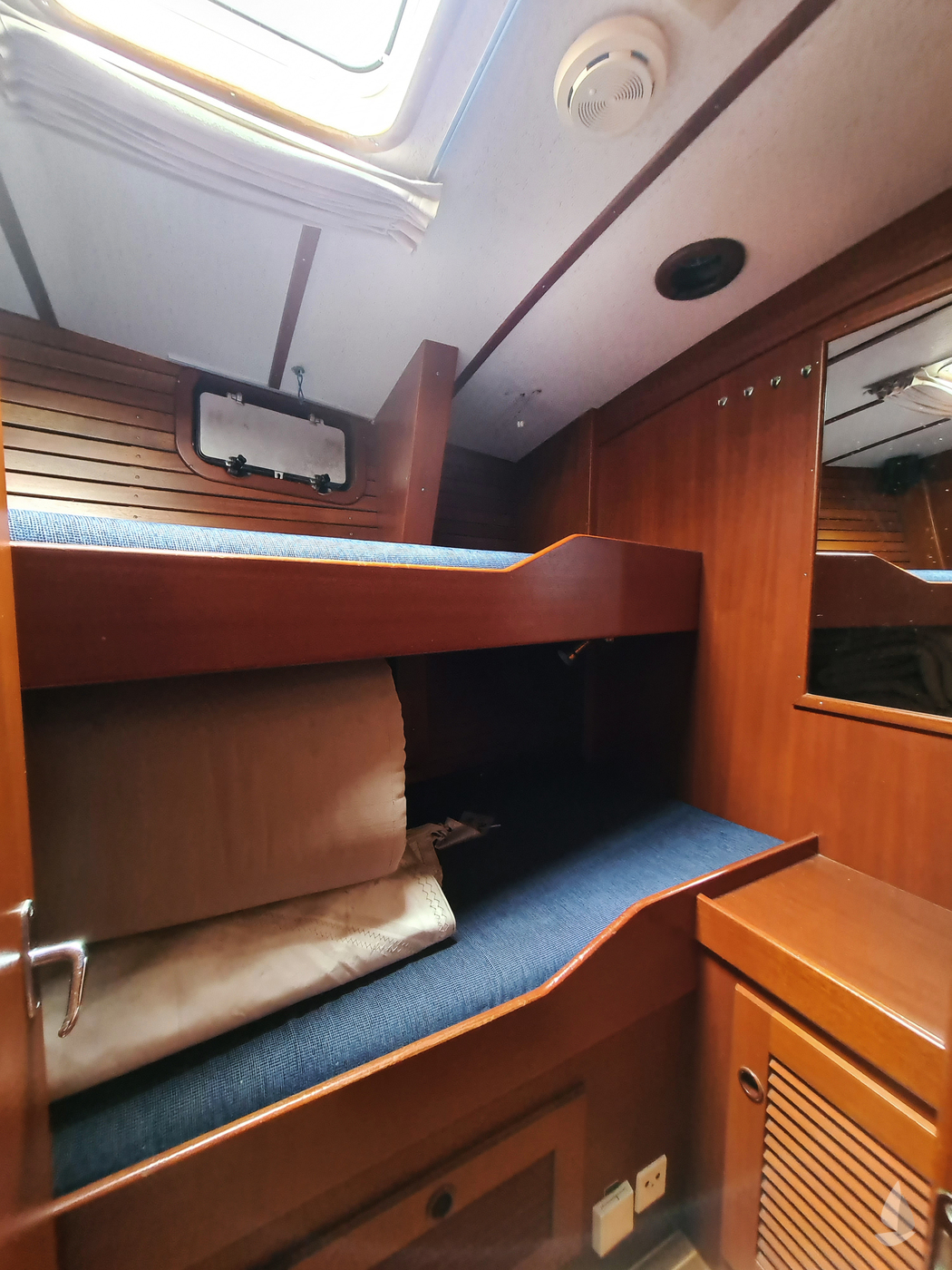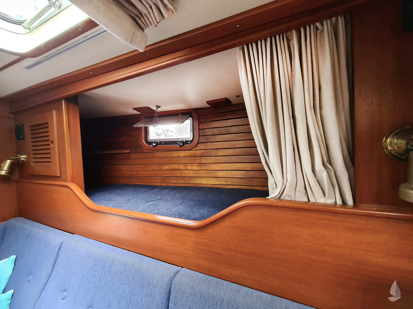 CabinsEigenaars hut in het achterschip, V-bed in de boeg, stapelbed vlak bij de boeg en twee stapelbedden in de salon.