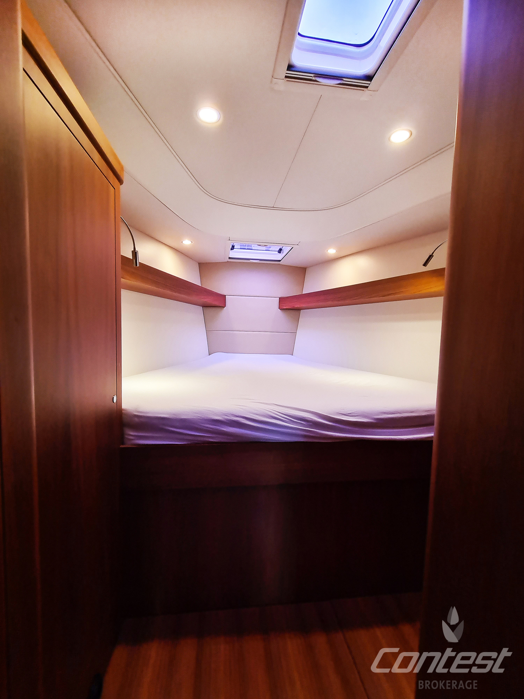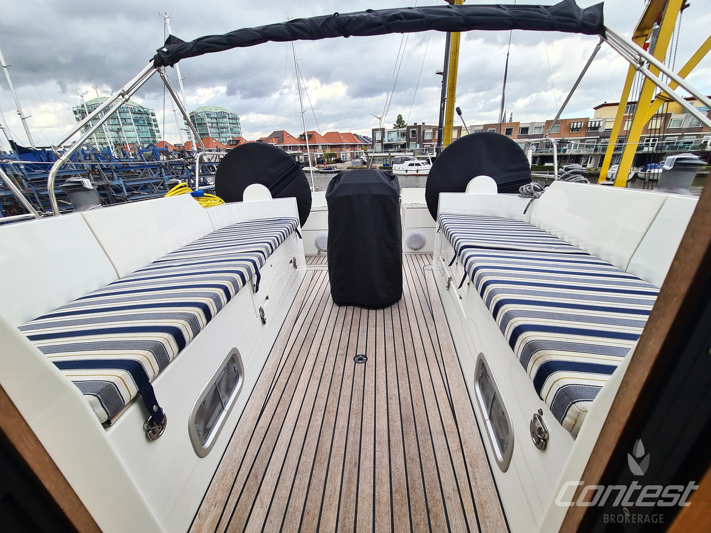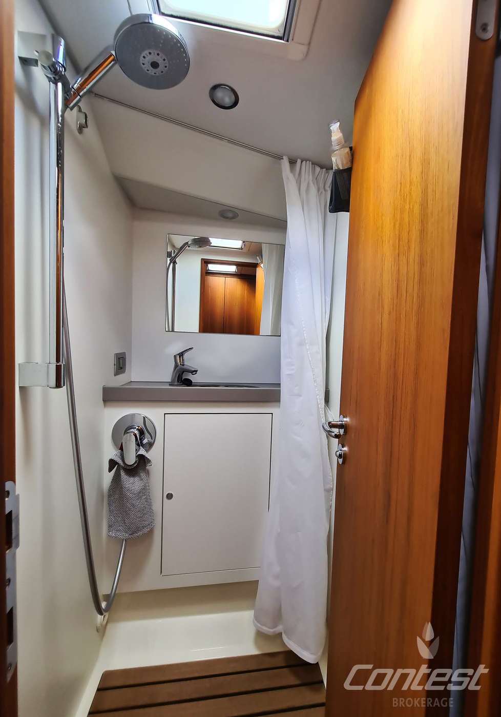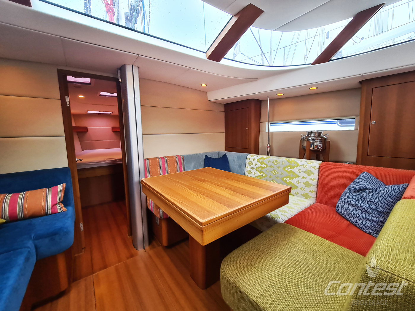 Winning the "Yacht of the year", award her versatility, quality and speed are internationally recognised. She is sailed easily due to her electric winches (all!) for hoisting / reefing the mainsail and her electric furling genoa, this will ensure easy handling under all circumstances. Important features are double laminated panoramic window, handcrafted teak joinery, huge galley with large fridges, generator, heating, watermaker, washing machine and folding transom / bathing platform. The twice winner of the Contest Cup in mallorca is now availble for sail, uh sale! Come over to our Contest brokerage sales marina in Medemblik, The Netherlands. note this is a preliminary brochure!