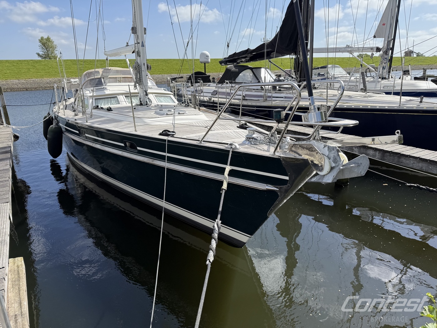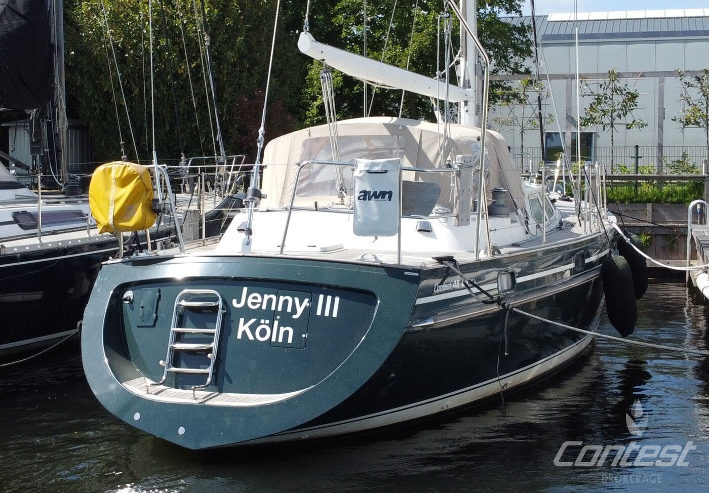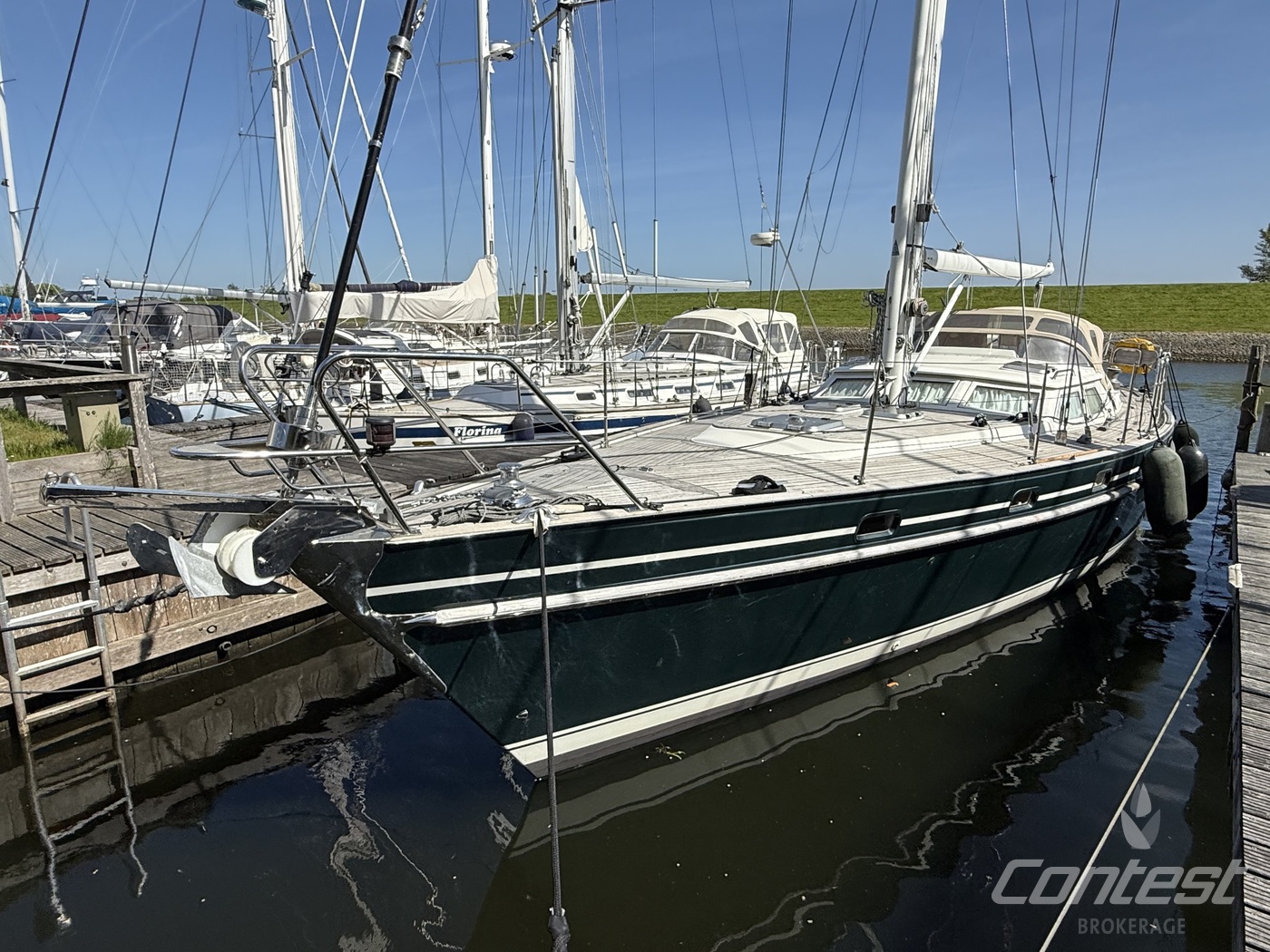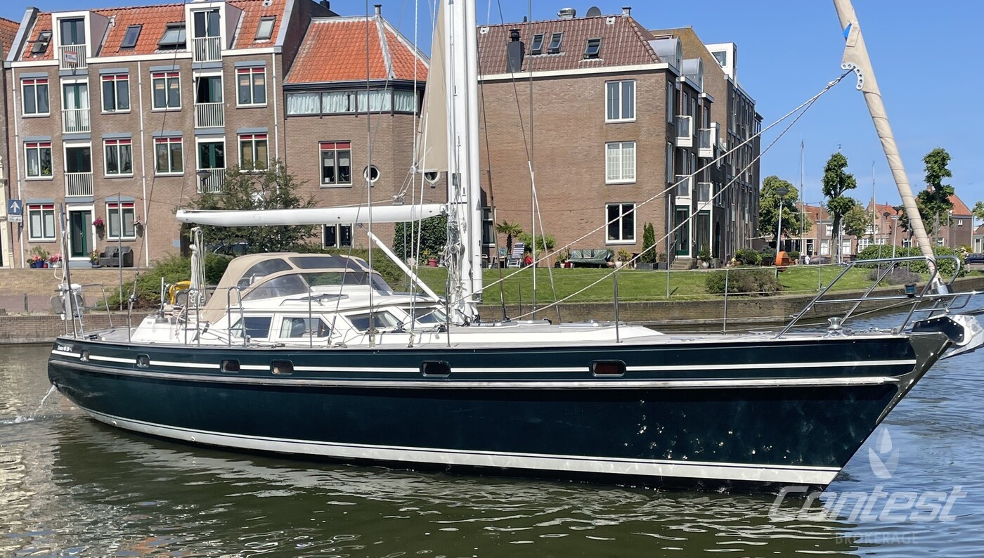 Jenny 3, a well-cared-for Contest 48CS with a classic dark green hull. Designed by George Nissen and Dick Zaal, and built in 2000 by Conyplex under Lloyd?s certification, she is a capable and comfortable blue water cruiser.